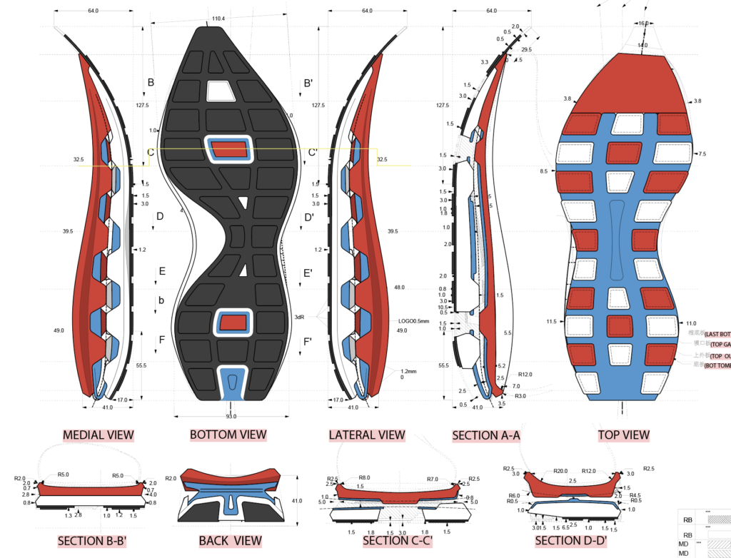 Careful inspection of digital and physical 2D and 3D CADs and models of all outsole and midsole components | Revisions made to reflect manufacturing feasibility and performance requirements of the shoe